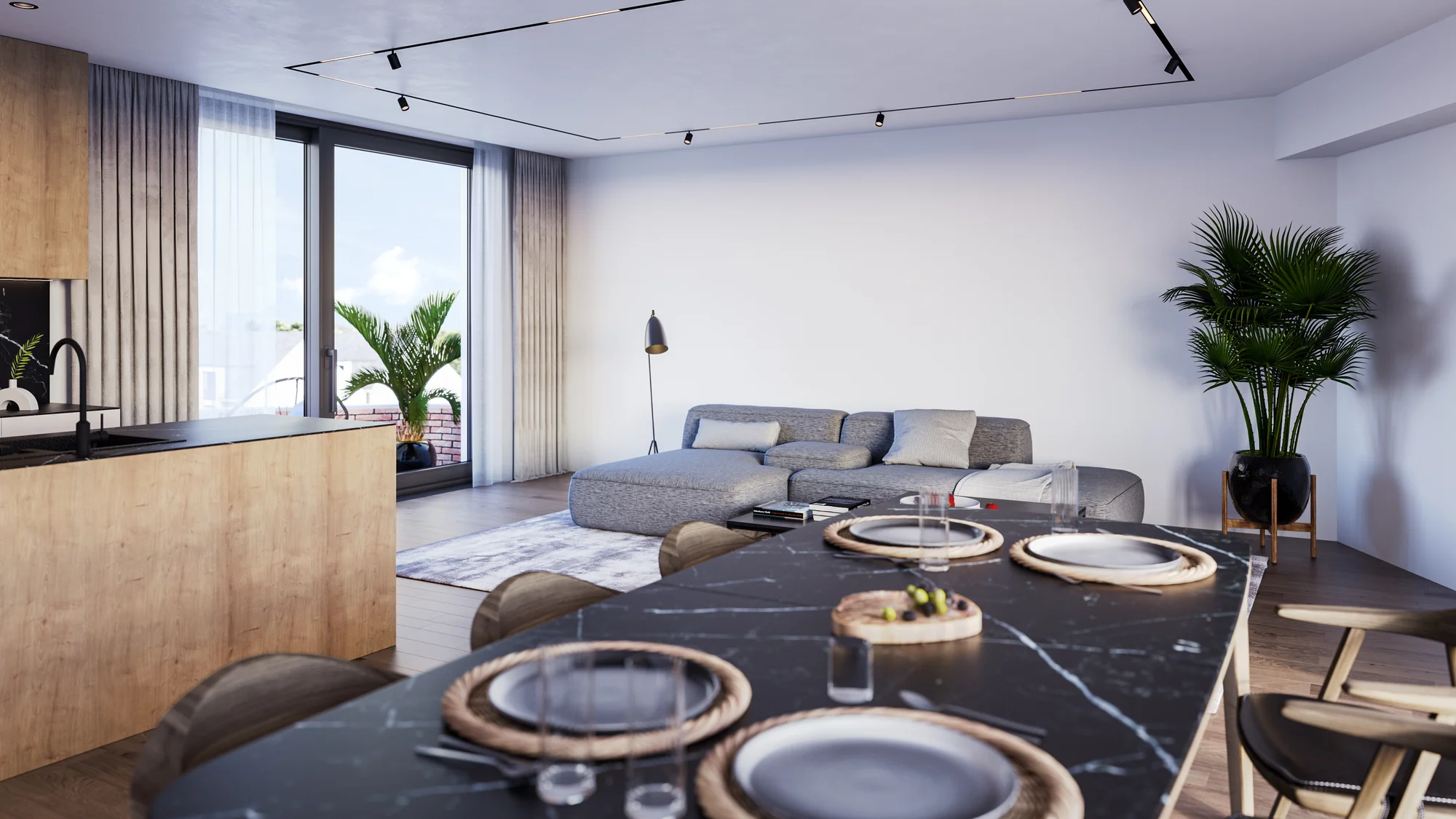 De interieurvisuals brengen de verschillende appartementen tot leven met aandacht voor ruimtelijkheid, materiaalgebruik en lichtinval. Van de open leefruimtes en keukens tot de badkamers en inkomhallen, elke render toont de kwaliteit van de afwerking en het wooncomfort dat toekomstige bewoners mogen verwachten.